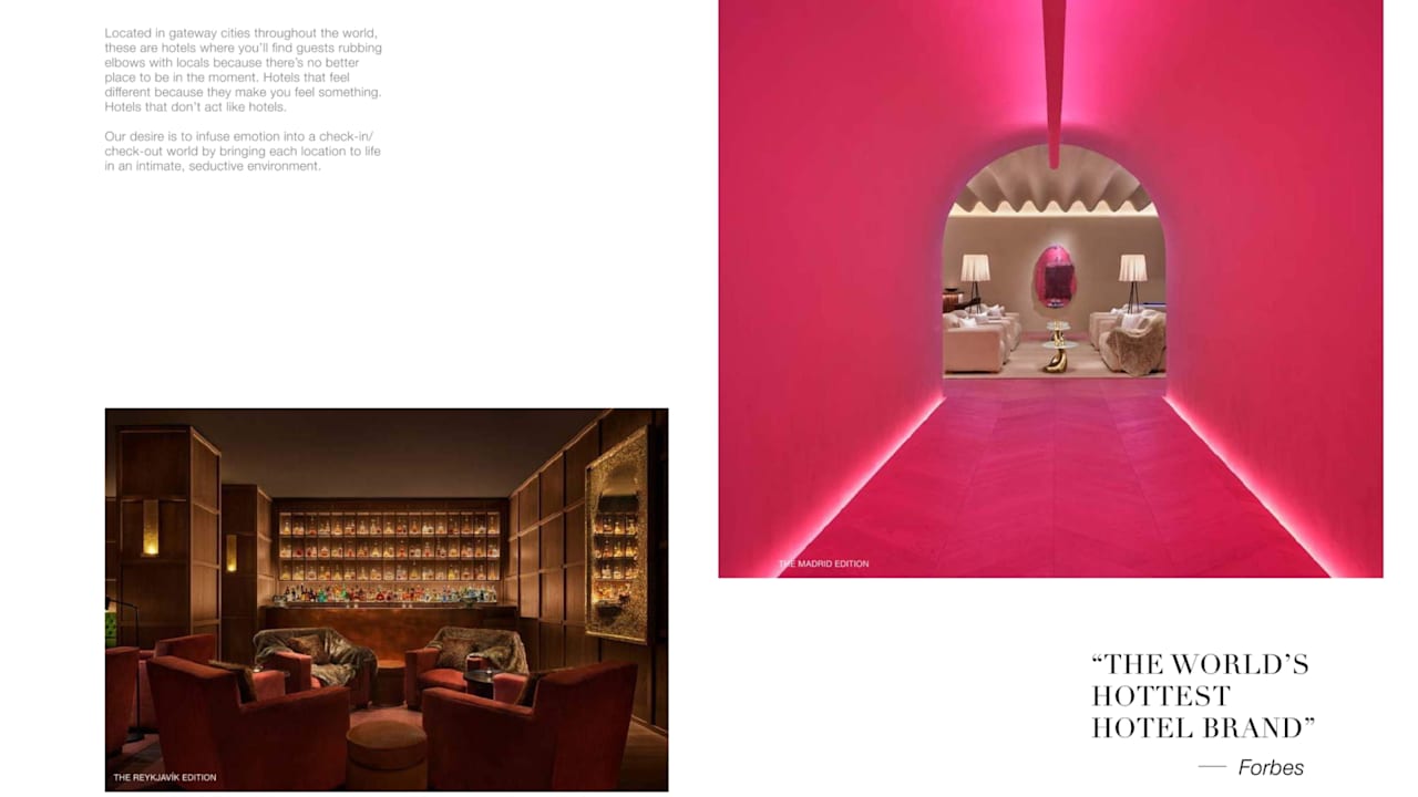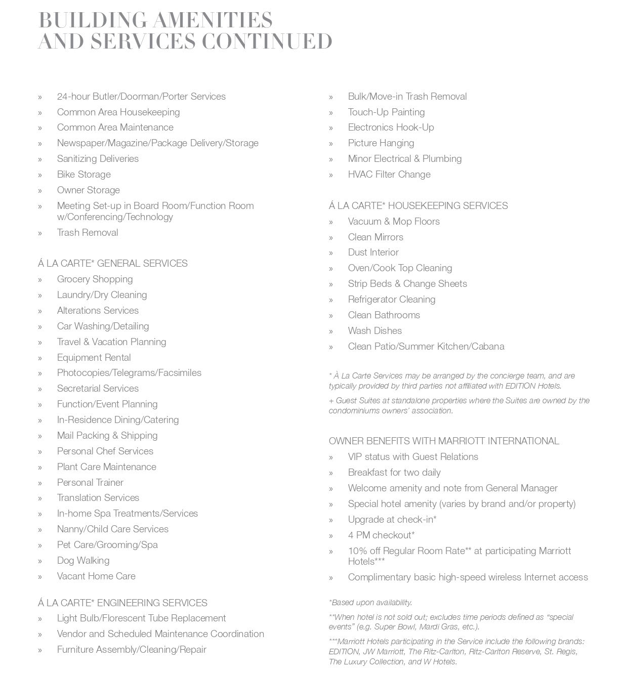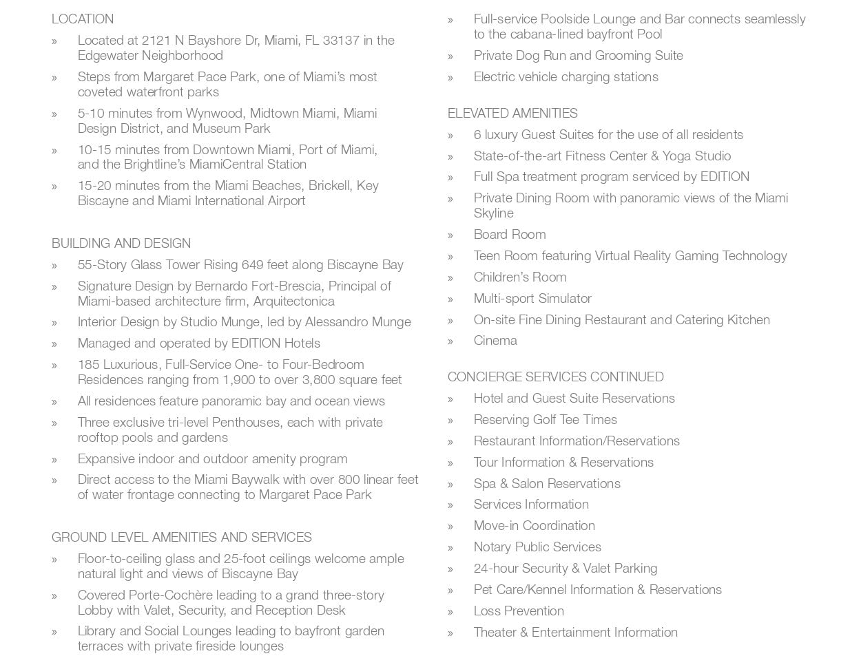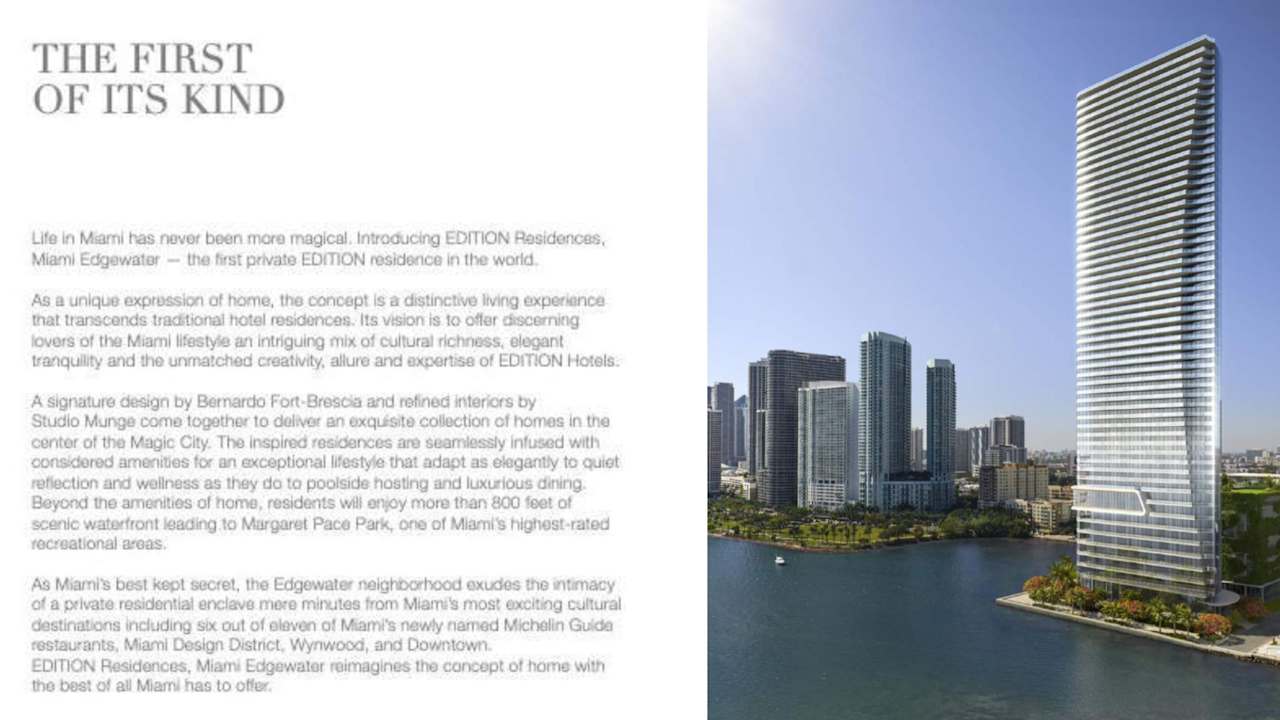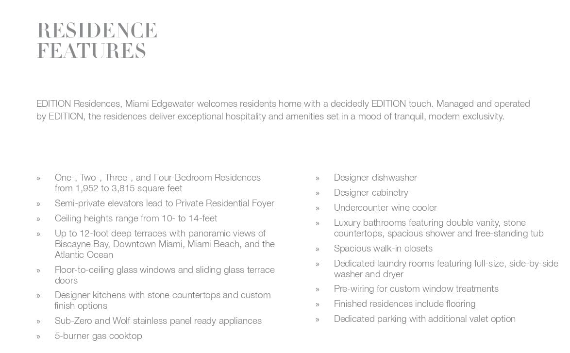 The amenities and services of EDITION Residences, Miami Edgewater reinvent the modern home with considered spaces for everyaspect of dynamic, elegant living. Residence owners will also enjoy exclusive privileges and access to all Marriott International Hotels andresorts around the globe, including EDITION, The Ritz-Carlton, St. Regis, W Hotels, The Luxury Collection, and JW Marriott properties.